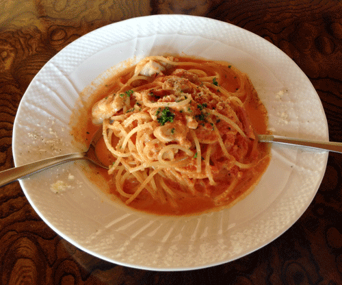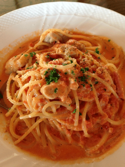 山城屋の定番ランチメニューのひとつ。県産素材をつかったシェフ自慢のトマトクリームパスタ。