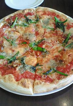 ピザは菜の花とトマトソース、チーズとベーコンが乗っていまして、ドリンクともどもたいへん美味しかったで♪