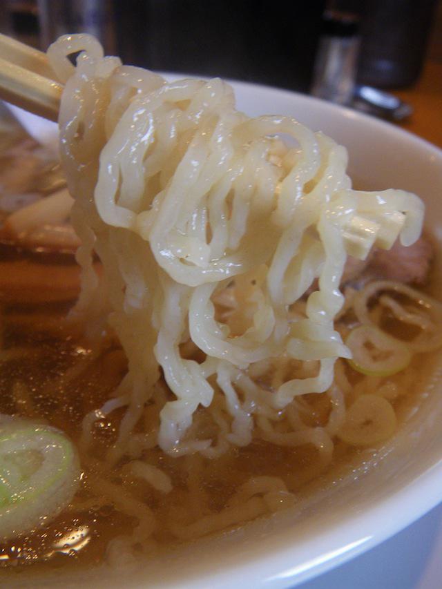 米沢ラーメン風の細い縮れ麺が泳いでます。