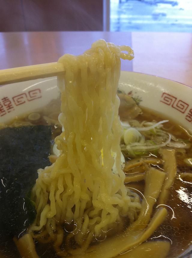 あっさり醤油スープに手もみ縮れ麺。