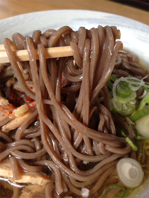 黒くて太目のお蕎麦にコリコリの親鳥。