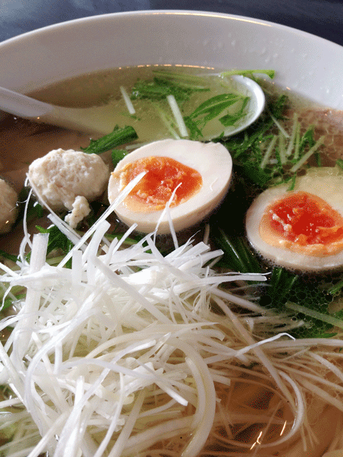 穂先メンマ、チャーシュー、つくね団子、味付玉子、白髪ネギ、水菜がのっています。