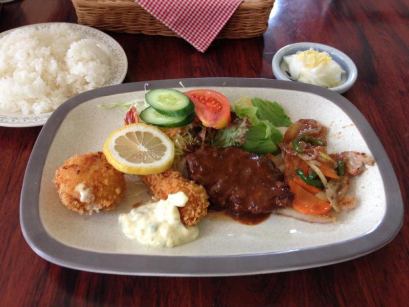 昔ながらのレトロな洋食屋さんグリルおおばの定番ランチです。ポークソテー&ハンバーグ&海老フライ&クリームコロッケの4種盛りのランチプレート。