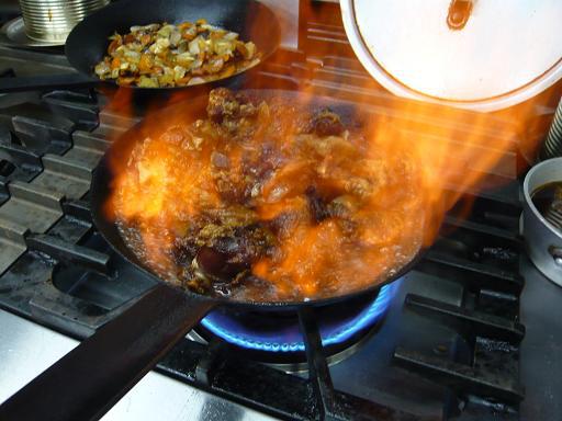 ということでこちらも負けじと厨房からファイヤーです。焼けた牛肉に赤ワインを注ぎ込んでオレンジ色の炎が。