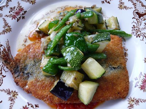 写真はパン粉をつけてフライパンで焼いて、トマトソースと付け合せにはズッキーニやナスなどをから揚げにしてラビゴットソースでさっと混ぜて添えています。