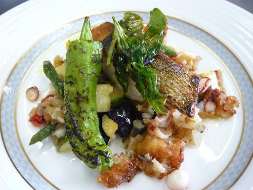 写真は魚料理で、貝類に軽くパン粉を付けてカリッとあげたものと夏野菜をソテーしたものをワインビネガーで合わせて付けあわせを作り魚に添えています。