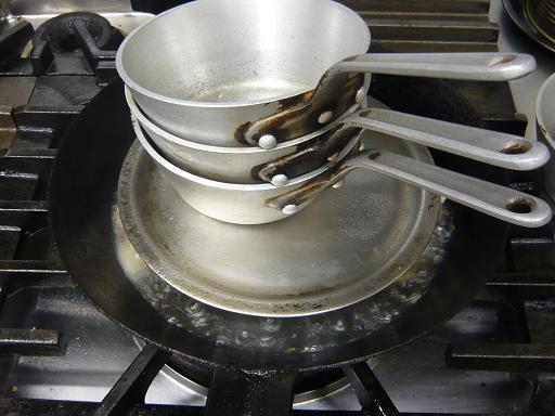 石ころを乗せるわけいかないのでナベを重ねて焼いています。
