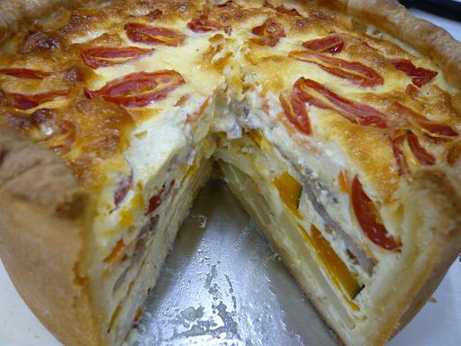 写真は何層にも重ねた特大のキッシュです。直径18センチ、高さは6センチ以上。
