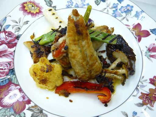 写真上は、焼き野菜とふぐのムニエル。冬の野菜がおいしくなってきています。