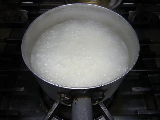 洗った米を鍋に入れて、強火で炊き始め沸騰したら全体を一かましして200度のオーブンへ入れて10分ちょっと。
