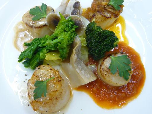 写真は帆立貝の料理です。4個の帆立貝を、クリーム、トマト、自家製ラー油、オニオンヴィネガーと4種類のソースで一皿を作ってあります。