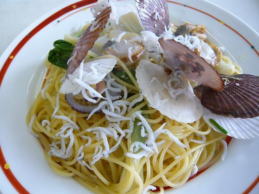 「ミニ帆立貝の後藤さんの畑で取れたアサツキのパスタ」