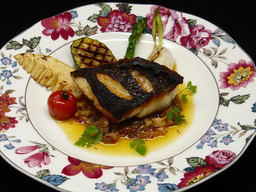 写真は「黒ソイのポワレ、焼き野菜と自家製フレンチラー油ソース添え」