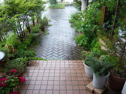店の玄関から取った写真ですが、前の道路が雨で霞んで見えます。