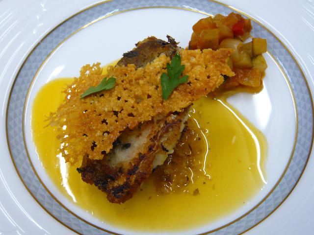 正面がカリカリ、中はしっとり、ソースはちょっとピリカラ、そしてチーズのチュイルを添えています。