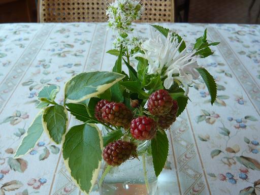 上の写真はあまりにも暑いので、せめて室内とテーブルだけは涼やかにしたいとマダムが店の周りからハーブなどを集めて挿してします。
