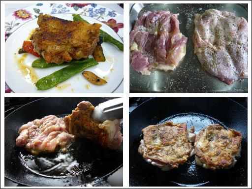 左上から完成品、右上が塩、コショウとハーブを振って数分おいたところ、左下がフライパンで皮の面をじっくり、こんがり焼いたところ、右下がひっくりかえして余熱で火を通しています。