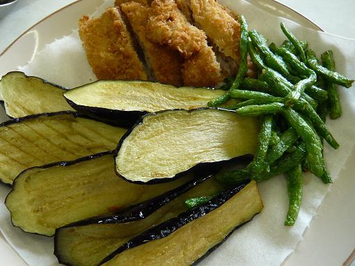 写真は夏の定番おかずは決まってナスとササギの天婦羅か生姜醤油を付けて唐揚げか。