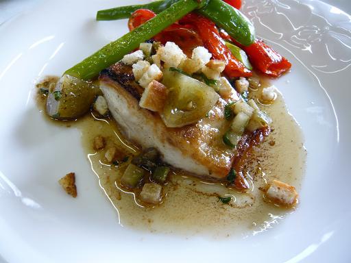 焦がしバターにレモン汁、ピクルス、ケッパー、イタリアンパセリを加え、カリカリのクルトンを添えています。