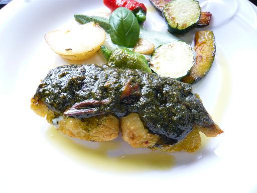 写真は 魚のポワレ、バジルとチーズと焼きトマトを使ったピストーソースです。
