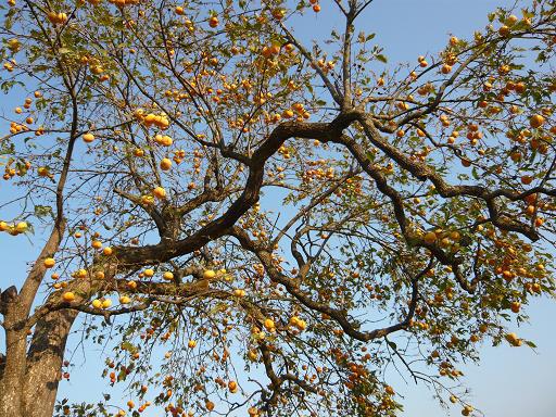 写真はしばらくぶりで歩いた最上川の堤防。土手の下の畑の真ん中にある柿の木、