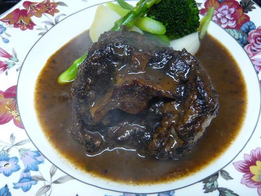 写真の料理は豪快な一品ですが、「牛尾の赤ワイン煮こみ、ブルゴーニュ風」ブルゴーニュ産の赤ワインで煮込んだもので本当にオーソドックスな料理です。