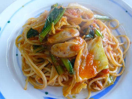 上の写真はジュアンランチの「ファインのソーセージとキャベツと小松菜のトマトパスタ、塩麹風味」