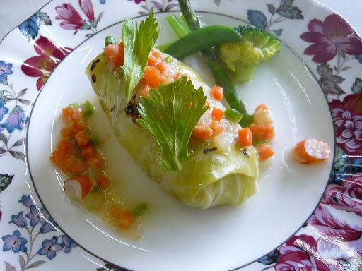 写真は我が家の春メニューから、ホタテ貝のムースを平目で挟んでキャベツで包んで蒸した「シューファルシ、プランタニエ」小さな野菜を加えたヴィネガーソースを添えています。