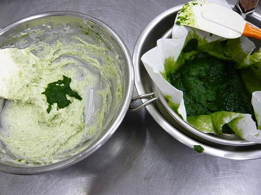 綺麗な緑色のほうれん草と白い魚のムースを合わせると淡い若草色のムースが出来ます。