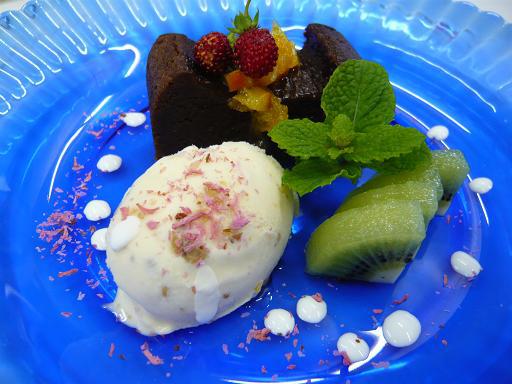 飾りのフルーツは前回のブログで紹介した小さなイチゴのワイルドストロベリー。チョコレートとも良く合うオレンジのコンフィと一緒に盛り付けて