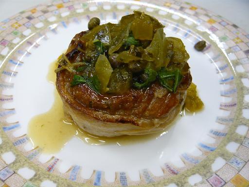 写真は「おきたま豚フィレ肉のスービット(真空調理)をした肉に行者菜と青トマトの自家製ジャムソースを添えています」