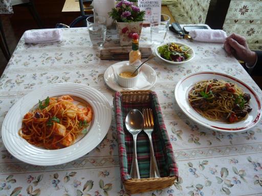 さて気を取り直して、写真はおすすめパスタ2品、右は牛肉の赤ワイン煮のラグーパスタと左は大きなホタテ貝と海老のペスカトーレです。