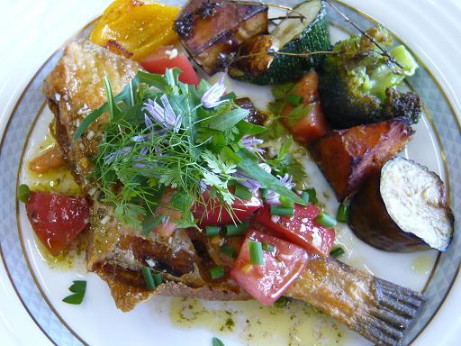 ・魚料理: 魚のポワレと野菜のショートパスタ添え