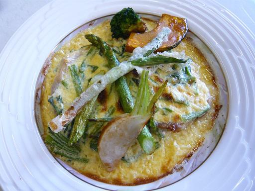 地元の春野菜のホウレン草、カブ、アスパラブロッコリー、それにニンニクの葉などがいっぱい入ったクリームソースをかけて皿ごとオーブンに入れて焼いています。