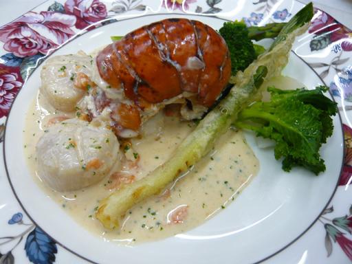 「オマール海老とホタテガイのワイン蒸し、エシャロットのクリームソース」