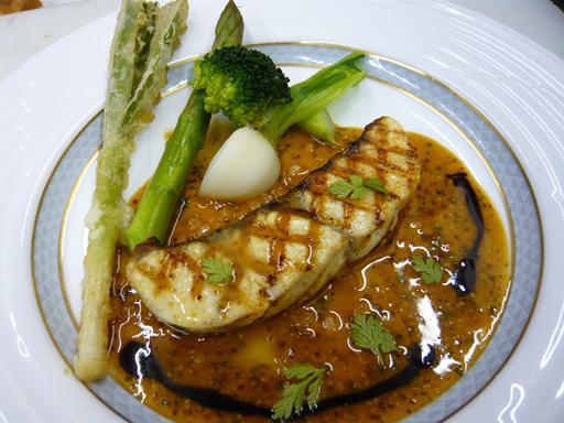 ・魚料理: 魚のムニエルと野菜のクミン風味カレーソース