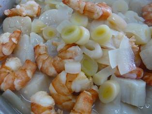 上の写真は海老と帆立貝と、ポワローのワイン蒸しマリネです。
