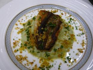 写真上 魚料理は庄内産地魚のポワレと若草色の野菜のクリームソース、香草パン粉添え。
