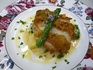 ご飯をプラスして生クリームとパルメザンチーズ加えたリゾットを作りそこへ別に焼いた鶏肉のソテを添えた一品です。