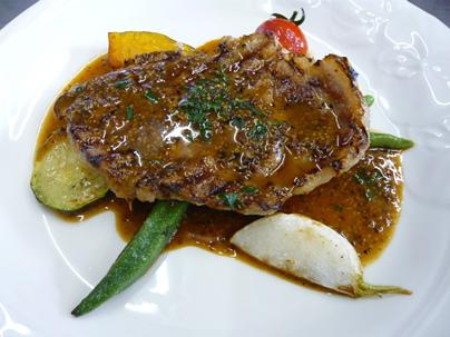 塩漬けにしたおきたま豚のグリル、黒粒胡椒風味。