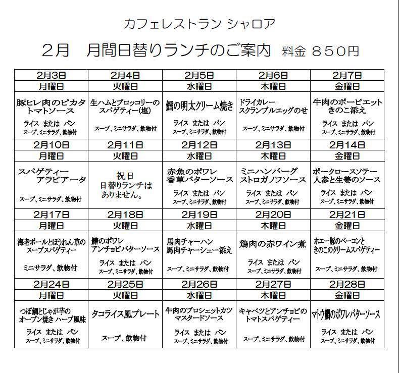2月の日替わりランチ予定表ができました!