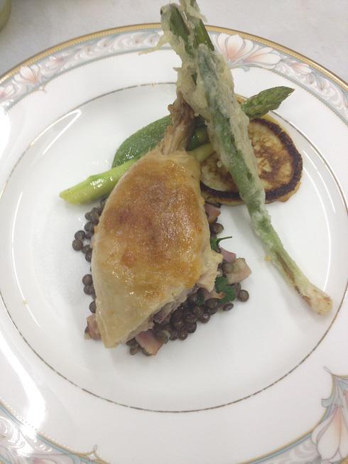 今晩は 日増しに暖かさを感じてくるに従って身体のこわばりもほぐれてガチガチにこわばっていた身体が何となくホッとリラックスできるようになってきました。でもまだまだ寒さは残りそうで来週はゆるっとした頃に寒の戻りが来るそうですので体調管理を万全にしましょう。...さて明日からは3月ですね。大きな行事も目白押しで社会人では歓送迎会や学生の皆さんには卒業式に入学試験、そして入学の準備等々学生も父兄もの皆様には忙しい月。無事に乗り切ってもらってピッカピカの春を向かえてほしいものです。当店も3月からは冬から春のメニューに移って行きます。卒業、合格、入学、入社 などのお祝いや誕生日や結婚記念日等のお食事に最適なコースメニューをご用意しております。ぜひ春の記念日に当店をご利用ください。また4月14日からは2014年度のジュアン料理教室が始まりますので、こちらもぜひチェックしてみてください。3月、4月の営業日、定休日 コースメニュー、料理教室等は下記アドレスより詳細をご覧いただければ幸いです。ジュアンホームページ トップページから各ページをご覧ください。http://www4.ocn.ne.jp/~juin/写真は岩手産地鶏もも肉のコンフィです。塩漬けにした鶏肉を低温の脂の中でじっくりと柔らかくなるまで火を入れて、皮をパリパリになるくらい焼いたものです。下に添えてあるのはフランス産の緑レンズ豆で独特の風味があります。