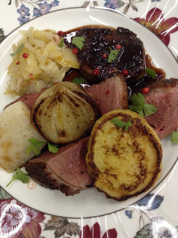 ジビエの季節です。フランス産鴨むね肉(マグレ・ドゥ・カナール)のロースト、フォワグラ添え。エシャロットと自家製ブラックベリーのソース。
