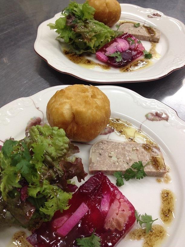 牛肉の赤ワイン煮を包んだ揚げ肉まんとフォワグラ入りのパテ、野菜のテリーヌの前菜。スープは飯豊町雪室ジャガイモと長井産のポワローのスープ。飾りにポワローのから揚げを散らしてあります。いい香りです。