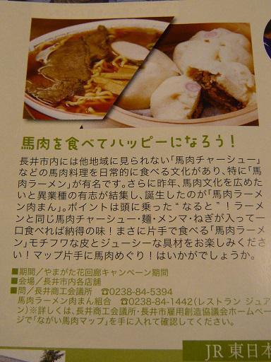 2015年 やまがた花回廊キャンペーン ガイドブック内長井エリアで当「馬肉ラーメン肉まん」が紹介されております。4月4日(土)〜7月12日(日)の期間下記加盟店でお買い求めできますので、このピンクの冊子と馬肉ラーメン肉まん片手に街歩きを楽しんでみてはいかがでしょうか。お問い合わせ馬肉ラーメン肉まん組合 フランス厨房ジュアン 0238-84-1442・丸川精肉店さん 0238-84-2983・後藤屋肉店さん 0238-88-2565・あやめそば 舟越さん 0238-84-2754・懐郷菓子 水上屋さん 0238-88-2772アツアツの蒸したてをご希望の方は、予めご予約をお願いいたします。