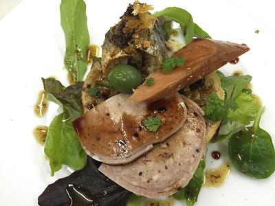 自家製パテとスモークサーモン&イワシのハーブパン粉焼きをポワローのかき揚げ、サラダと共に。
