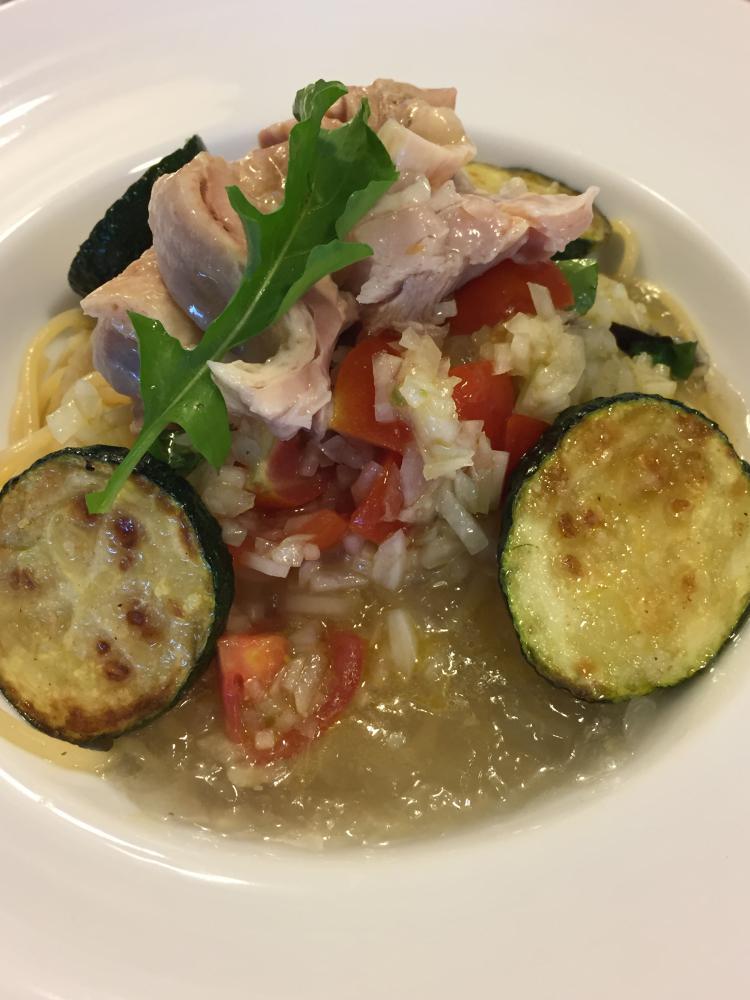 キンキンに冷えた当店オリジナル冷製パスタです。トッピングは一晩塩漬けにした山形県産ハーブ鶏を柔らかくハムのように仕上げ、ズッキーニは長井市伊佐沢後藤さんの畑から届いたものを焼いてあります。ランチタイムにいかがでしょうか。