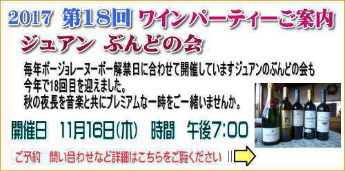 今年も多くの皆様にご参加いただき誠にありがとうございました。お陰様で大盛況の内に無事に終了することができました。次回は2018年11月15日(第3木曜日)を予定しておりますのでどうぞよろしくお願いいたします。 毎年恒例 ボジョレーヌーボーの解禁日に合わせて開催しているジュアンのワイン会です。セレクトした数種のワインと料理、プラス ライブスペースJAMのマスター達による生演奏も同時にお楽しみ下さい。11月16日(第3木曜日)午後7:00より料金 お一人様6000円(税込)参加ご希望の方は当店ジュアンまでお申し込み下さい。TEL:0238-84-1442当店ホームページhttps://r-juin.com/news.html