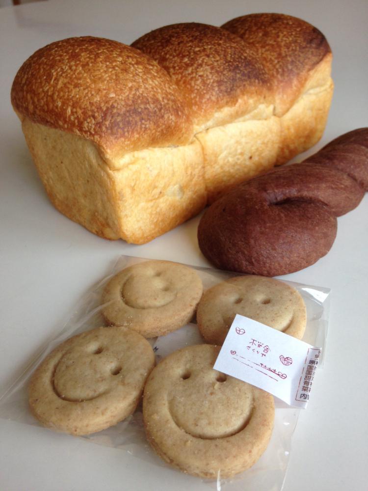 桜舎(さくらや)さんの自家製天然酵母の食パンとニコニコマークのオーガニッククッキーです♪