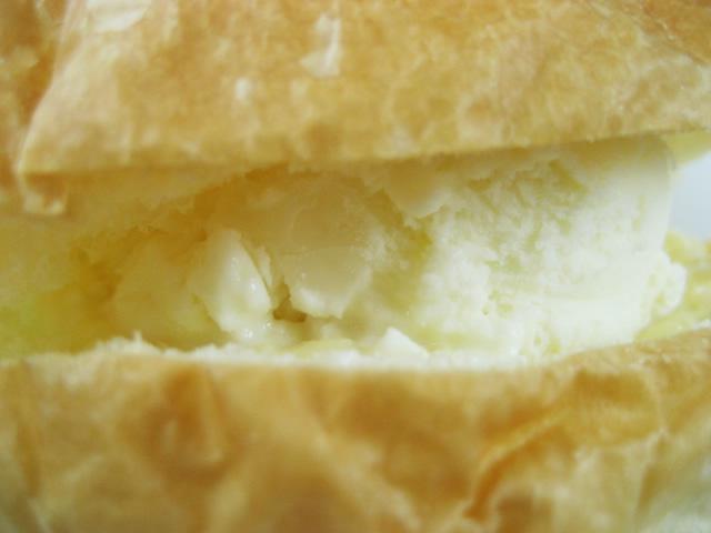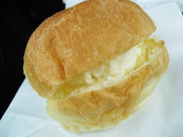 山形市パルシェのアイスクリームパン。ふっくらと仕上げたブリオッシュタイプの生地にバニラアイスとカスタードクリームを挟んでいます。